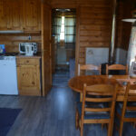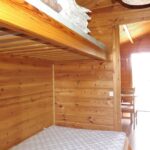 Łóżka: łóżko piętrowe (dolne szer. 120cm) + 2-osobowa sofa. Na łóżkach poduszki i kołdry. Pościel do wypożyczenia. Zakaz używania śpiworów!